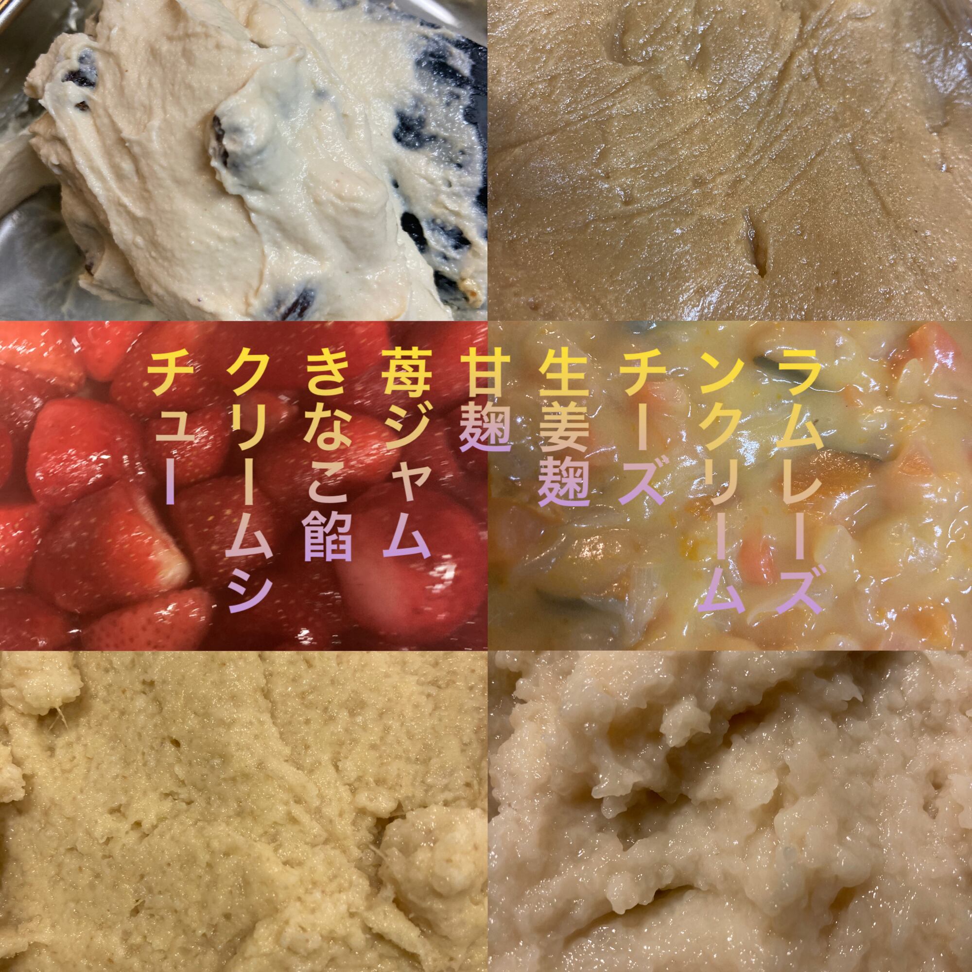 有機ストロベリーOGカカオニブOGカシューナッツ OGドライレーズン 無農薬レモン OGアールグレイ(デカフェ) 特別栽培りんご 無農薬生姜 アーモンドスライス 生麹 有機白玉粉 有機白味噌 OGくるみ 有機黒胡麻 有機シナモン ラム酒 有機片栗粉 有機きなこ 無農薬手亡豆 かぼちゃ 玉葱 人参(全て自然栽培) 自家製塩麹 OGホワイトペッパー 有機ナツメグ 有機パセリ OGチェチ粉 有機コーンミール自家製豆乳ヨーグルト OGバニラエクストラクト